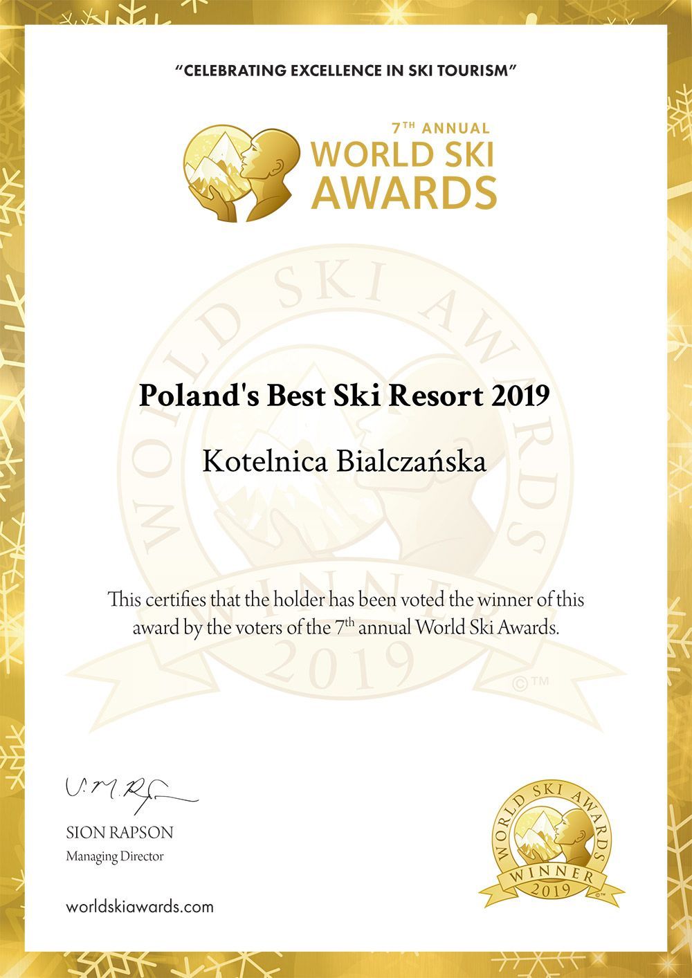 Już po raz czwarty z rzędu Ośrodek Narciarski Kotelnica Białczańska otrzymał zaszczytny tytuł Poland’s Best Ski Resort! Czyni nas to tym samym najlepszym ośrodkiem narciarskim w Polsce w oczach kapituły World Ski Awards.