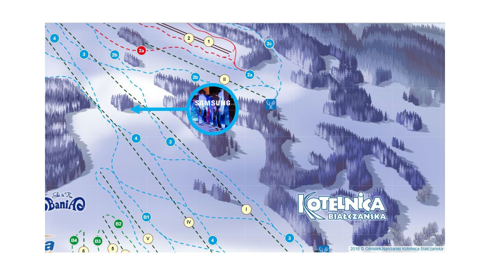 Strefa Samsung Nightography znajduje się pod laskiem na środku głównego stoku pomiędzy trasami 3 i 4. Dojazd kanapami Kotelnica I i Kotelnica Express